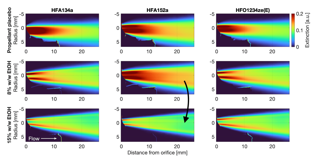The transition from high Global Warming Potential (GWP) propellants such as HFA134a to low-GWP alternatives such as HFA152a and HFO1234ze(E) in pressurised metered dose inhalers (pMDIs) poses challenges for inhaled pharmaceutical product development.